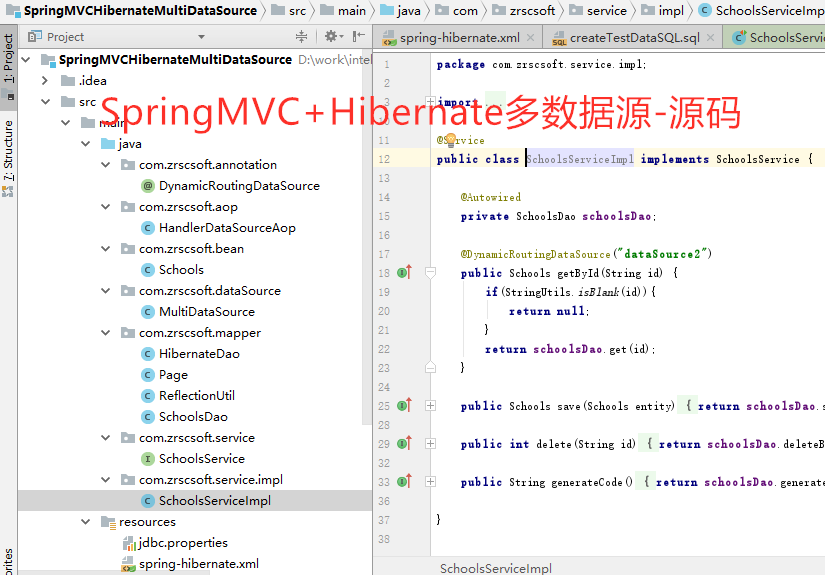 4.执行SpringMVCHibernateMultiDataSource\src\test\java\com\zrscsoft\service\SchoolsServiceTest.java单元测试方法